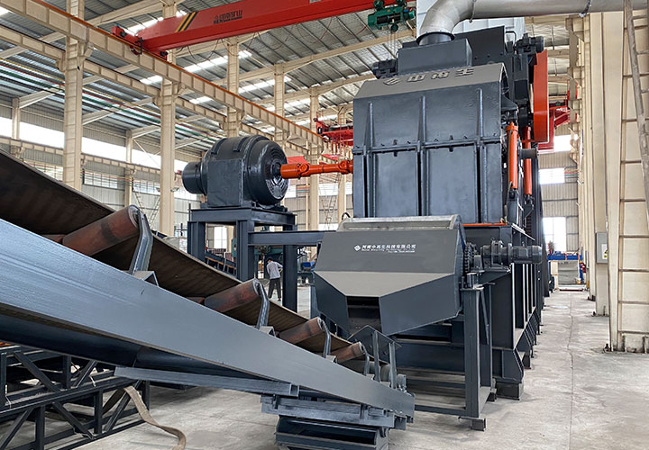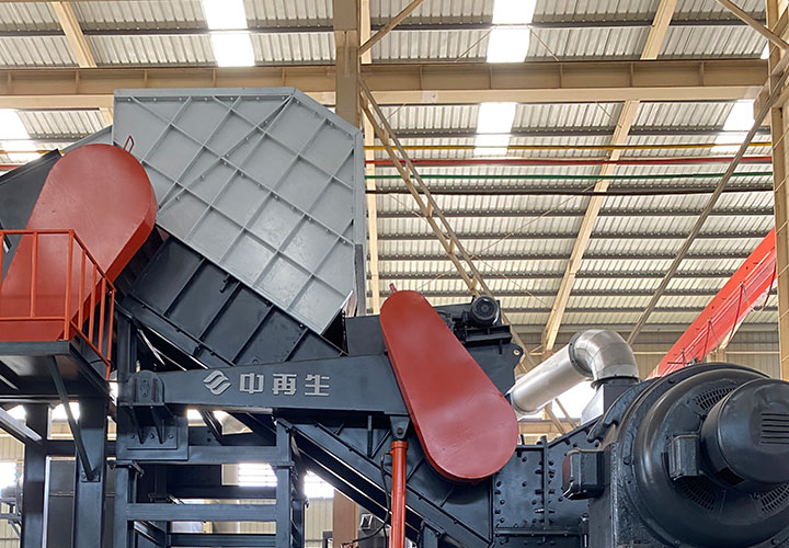 破碎線主機(jī)殼體采用特厚鋼板制造,內(nèi)襯為高錳鑄鋼件,可更換;主機(jī)轉(zhuǎn)子盤安裝于水平軸上,轉(zhuǎn)子盤圓周分布有銷軸,軸向懸有錘頭;主軸用滾珠軸承支撐,循環(huán)油強(qiáng)制潤(rùn)滑冷卻,并裝有溫度傳感器;進(jìn)料口裝有液壓輥筒喂料裝置,位置一高一低,同向旋轉(zhuǎn),能將大件松散物料壓扁,送入破碎腔內(nèi)。
