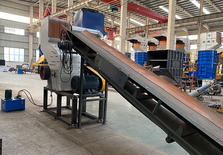 破碎線主機殼體采用特厚鋼板制造,內襯為高錳鑄鋼件,可更換;主機轉子盤安裝于水平軸上,轉子盤圓周分布有銷軸,軸向懸有錘頭;主軸用滾珠軸承支撐,循環(huán)油強制潤滑冷卻,并裝有溫度傳感器;進料口裝有液壓輥筒喂料裝置,位置一高一低,同向旋轉,能將大件松散物料壓扁,送入破碎腔內。