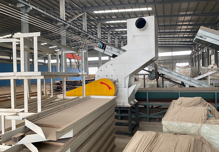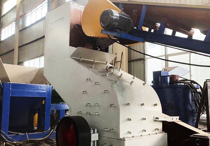 破碎線(xiàn)主機(jī)殼體采用特厚鋼板制造,內(nèi)襯為高錳鑄鋼件,可更換;主機(jī)轉(zhuǎn)子盤(pán)安裝于水平軸上,轉(zhuǎn)子盤(pán)圓周分布有銷(xiāo)軸,軸向懸有錘頭;主軸用滾珠軸承支撐,循環(huán)油強(qiáng)制潤(rùn)滑冷卻,并裝有溫度傳感器;進(jìn)料口裝有液壓輥筒喂料裝置,位置一高一低,同向旋轉(zhuǎn),能將大件松散物料壓扁,送入破碎腔內(nèi)。